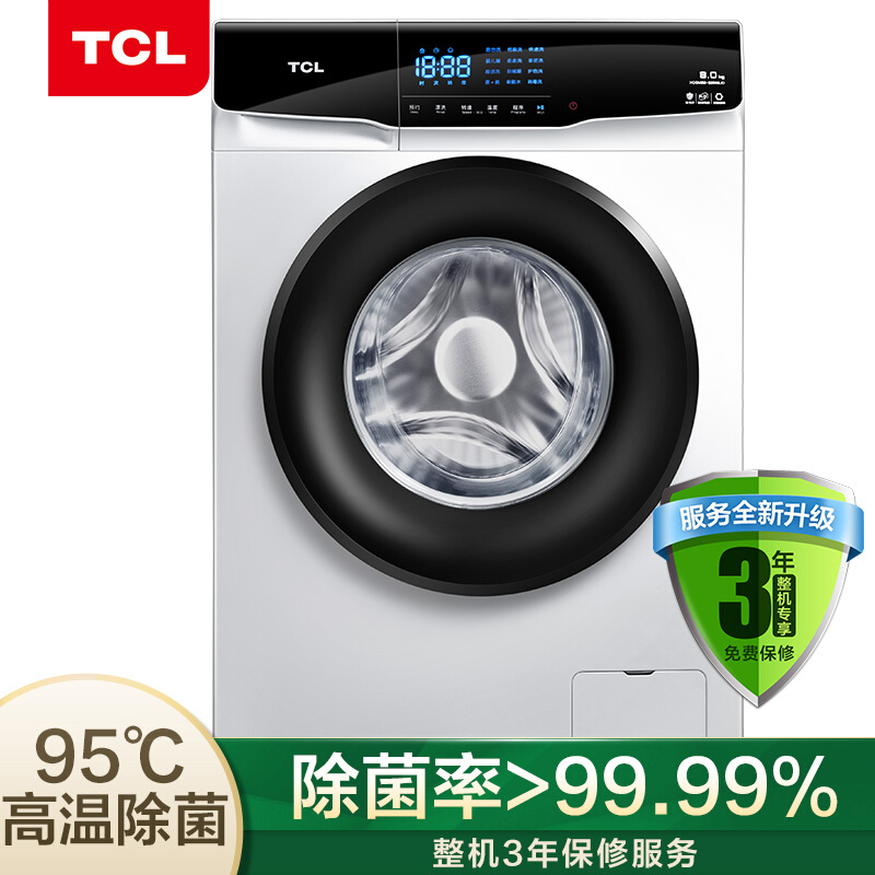 • TCL 8公斤 免污式免清洗变频全自动滚筒洗衣机 全面触控大屏 高温除菌除螨 皎月白 XQGM80-S300BJD