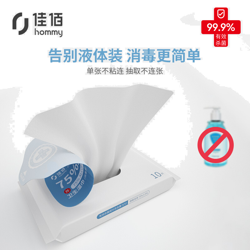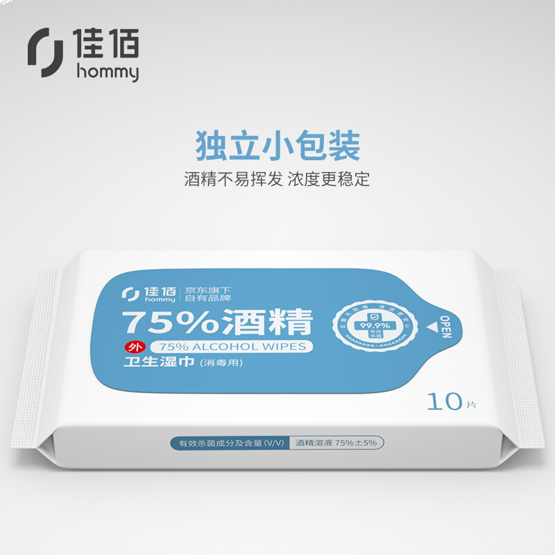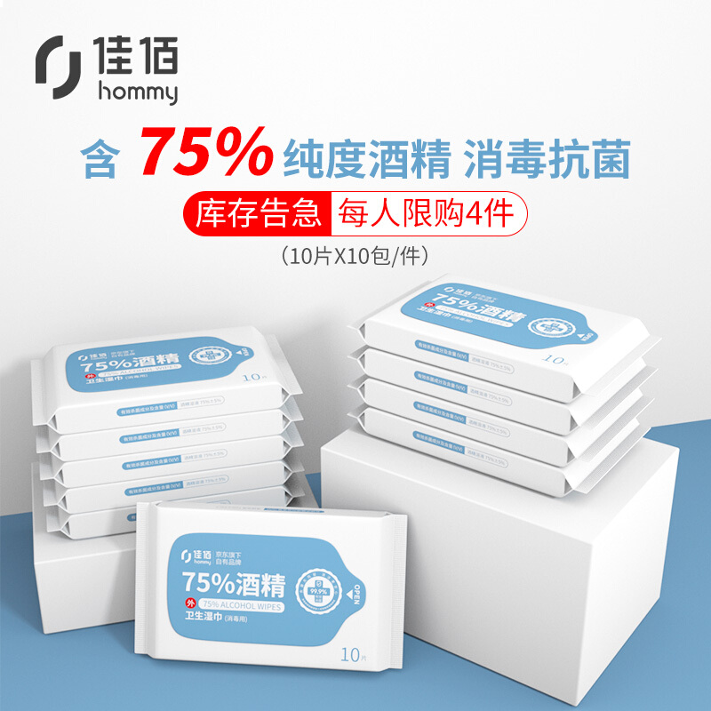 • 佳佰湿巾75%酒精消毒湿巾棉片 卫生湿纸巾一次性免洗手消毒液湿巾纸品 10抽*10包(量贩便携装)