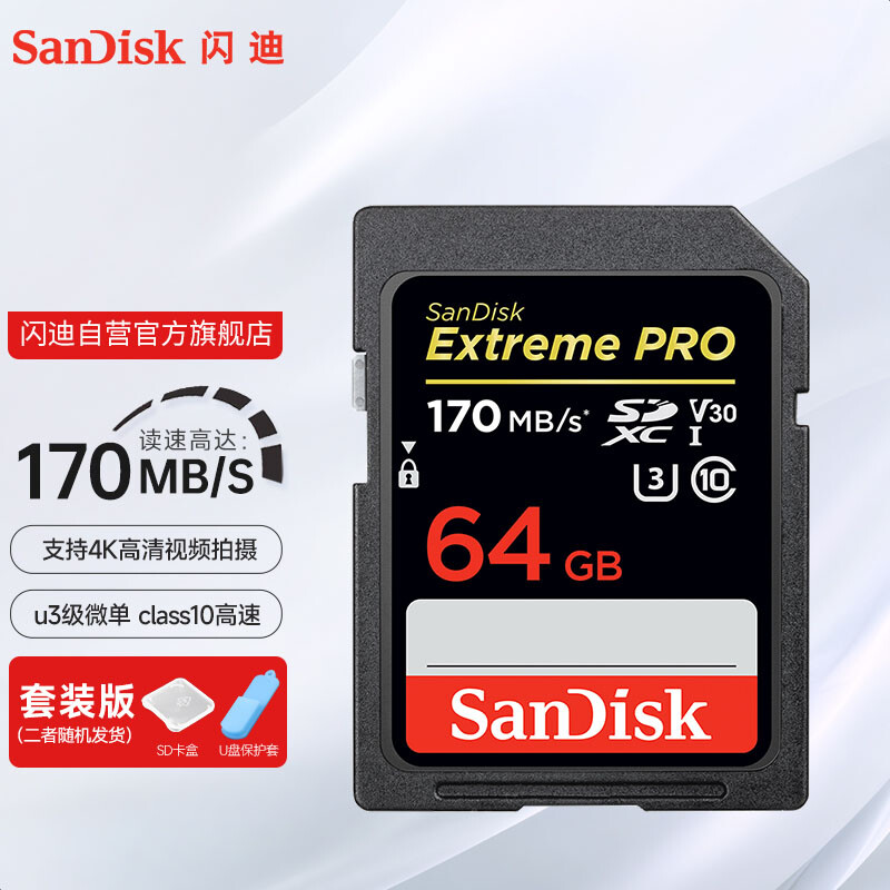 闪迪(SanDisk)SD卡 套装 4K高清单反相机内存卡 数码相机存储卡 至尊超极速 64G 读速170M/S 写入90M/S
