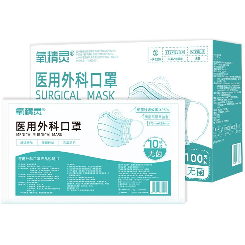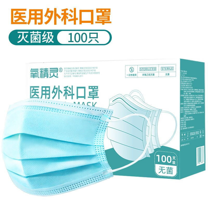 • 氧精灵一次性无菌医用外科口罩透气轻薄3层成人款100只