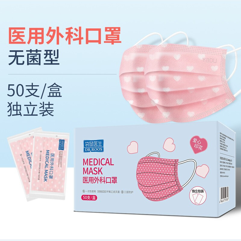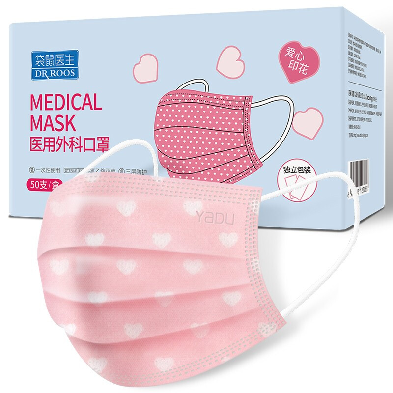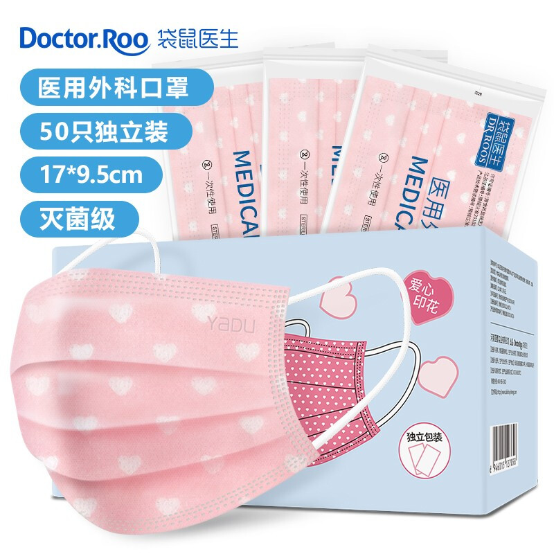 • 袋鼠医生 医用外科口罩成人三层印花一次性口罩单独包装 粉爱心独立装 50支/盒