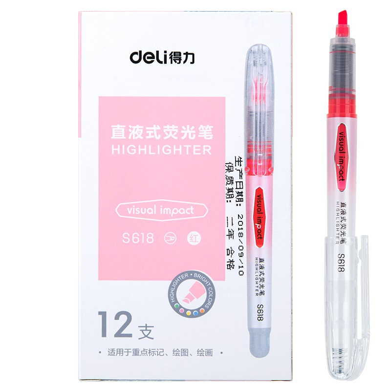 • 得力S618 红色 直液荧光笔 重点标记 手帐可用水性记号笔 大包装 36支装
