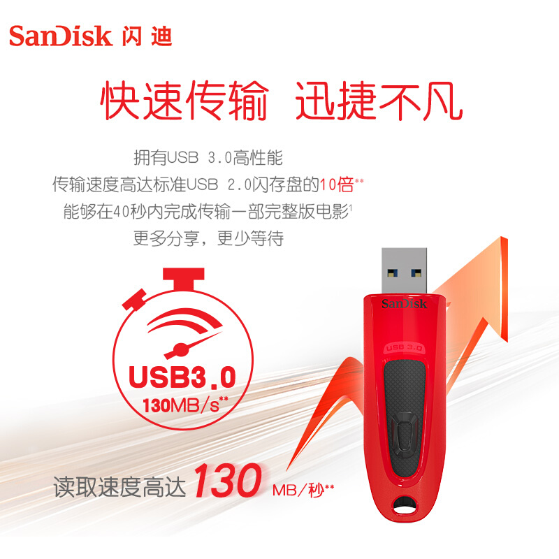 • 闪迪(SanDisk)64GB USB3.0 U盘 CZ48至尊高速 红色 读速130MB/s