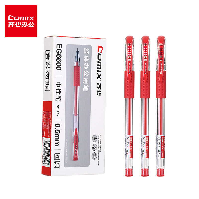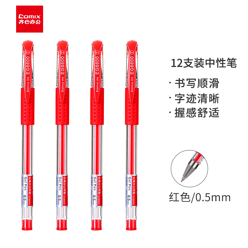 齐心(Comix)0.5mm红色经典办公子弹头中性笔 水笔签字笔12支/盒EG6600