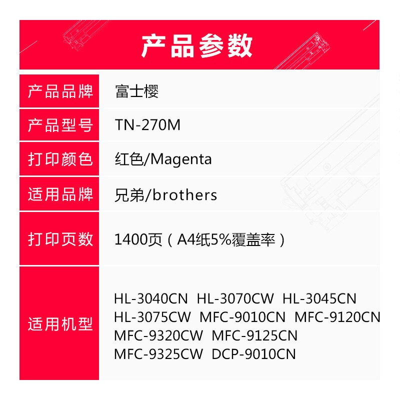 - 富士樱 TN-270M 红色墨粉 适用兄弟HL-3040/3045CN 3070/3075CW MFC-9010/9120/9125CN DCP-9010CN