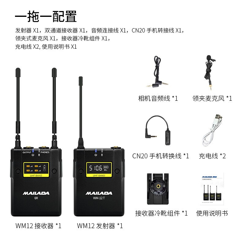 • 麦拉达 WM12 手机直播无线麦克风电脑录音领夹式小蜜蜂收音器单反相机摄像机采访话筒 WM12一拖一