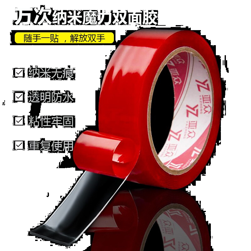 • 亚众 纳米双面胶 红膜双面贴强力无痕魔力胶带抖音同款 纳米防水不留痕 30MM*3M