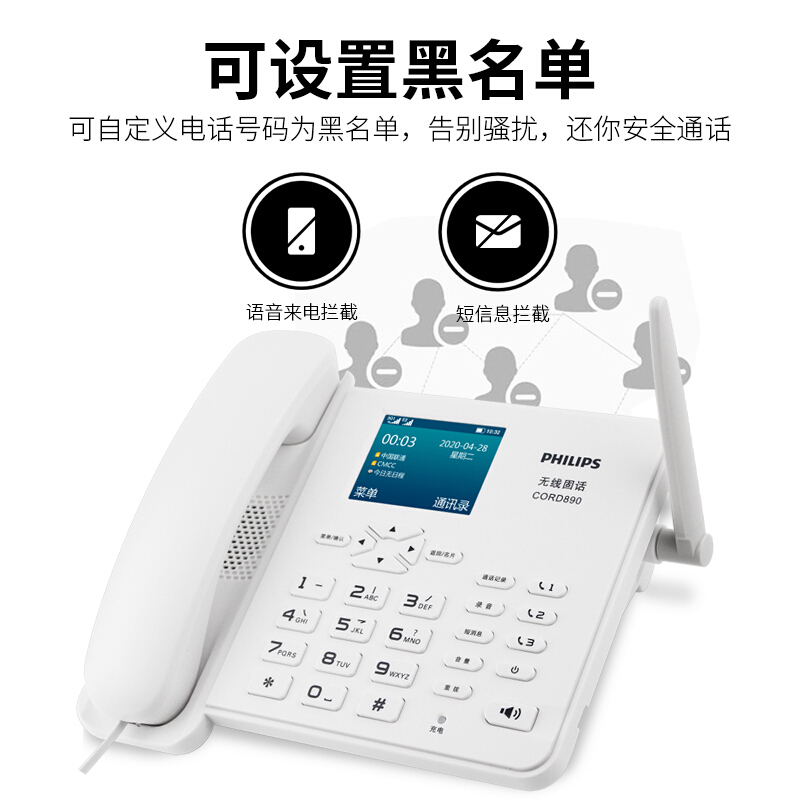 • 飞利浦(PHILIPS)插卡电话机 移动/联通固定插卡 自动录音座机 中文菜单 CORD890 白色16G版