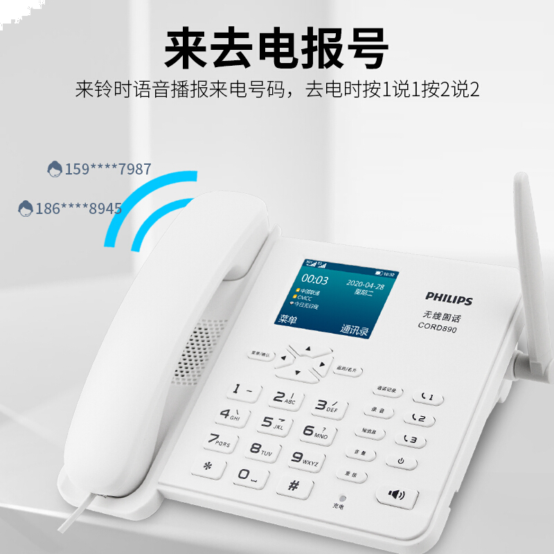 飞利浦(PHILIPS)插卡电话机 移动/联通固定插卡 自动录音座机 中文菜单 CORD890 白色普通版