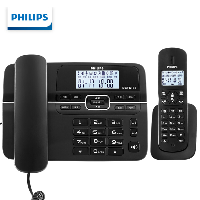 • 飞利浦(PHILIPS)数字无绳电话机无线固定座机电话子母机办公家用一键拨号/电话本 DCTG188 黑色(一拖一)