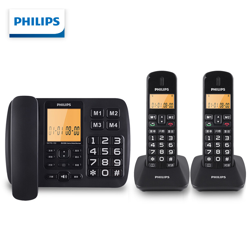 • 飞利浦无绳电话机家用子母机无线时尚办公固定电话座机一拖一二 DCTG152 黑色:一拖二