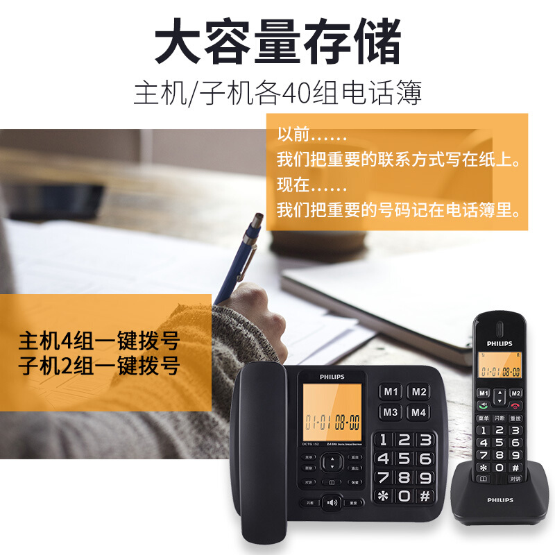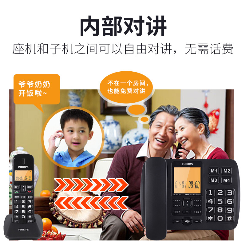 • 飞利浦(PHILIPS)无绳电话机 无线座机 子母机 办公家用 一键拨号 内部对讲DCTG152一拖一 (黑色)