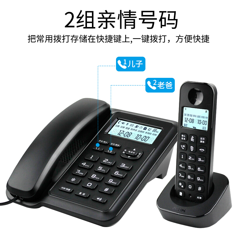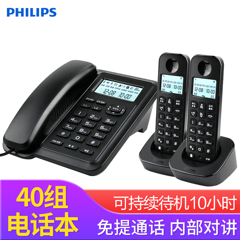 • 飞利浦(PHILIPS)数字无绳电话机 无线座机 子母机 办公家用 信号覆盖广 屏幕白色背光 DCTG167一拖二黑色