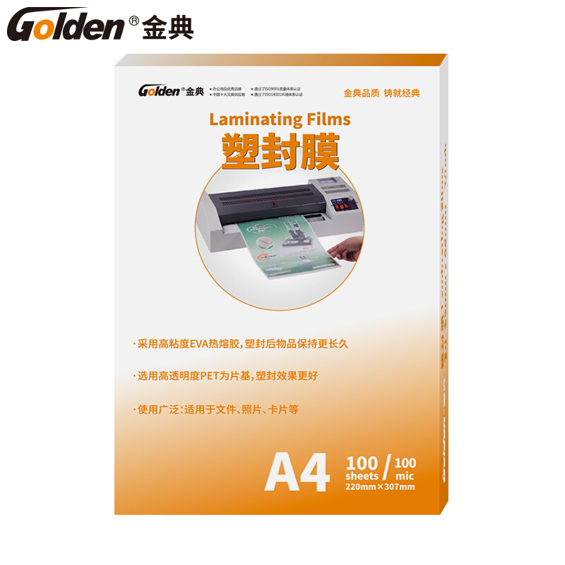 金典(GOLDEN)塑封膜A4塑封膜过塑膜护卡膜 过胶膜护卡膜100张/包 10C 220*307
