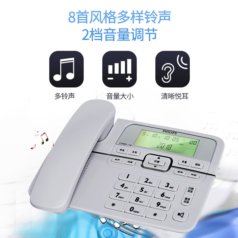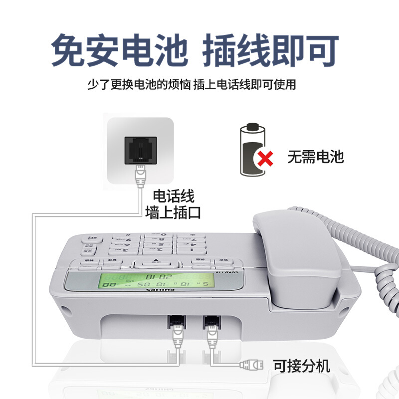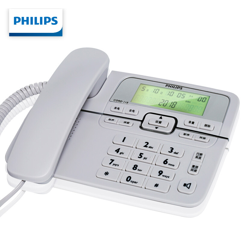 飞利浦(PHILIPS)电话机座机 固定电话 办公家用 来电显示 双接口 免电池 CORD118灰色