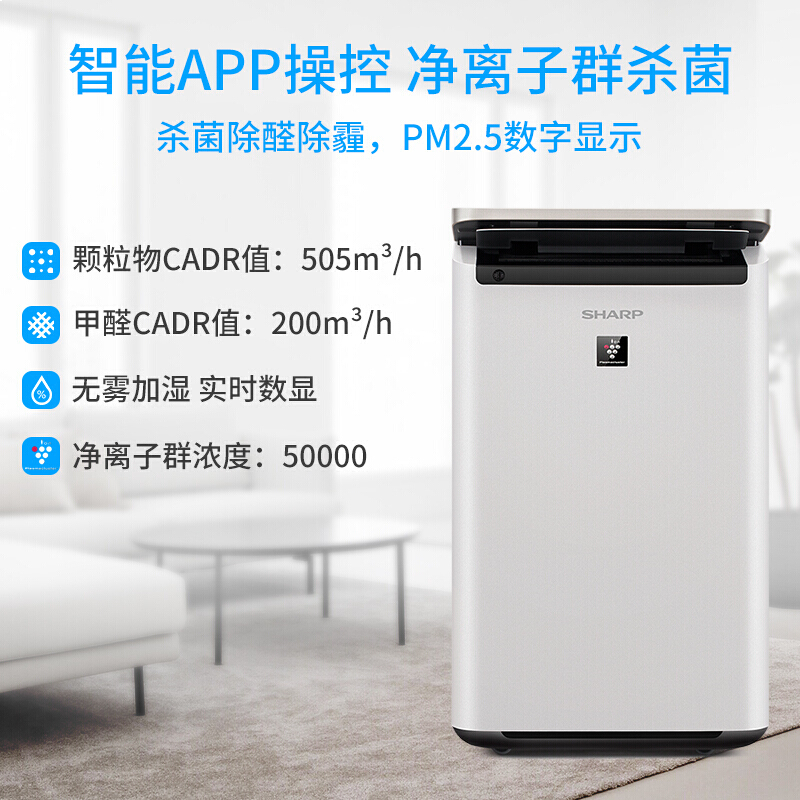 夏普KI-CJ70-W 空气净化器家用加湿机除甲醛智能远程操控PM2.5实时数显 50000高浓度净离子群杀菌