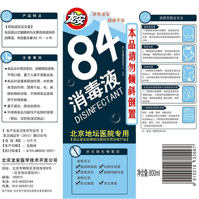 龙安84消毒液 800ml/瓶