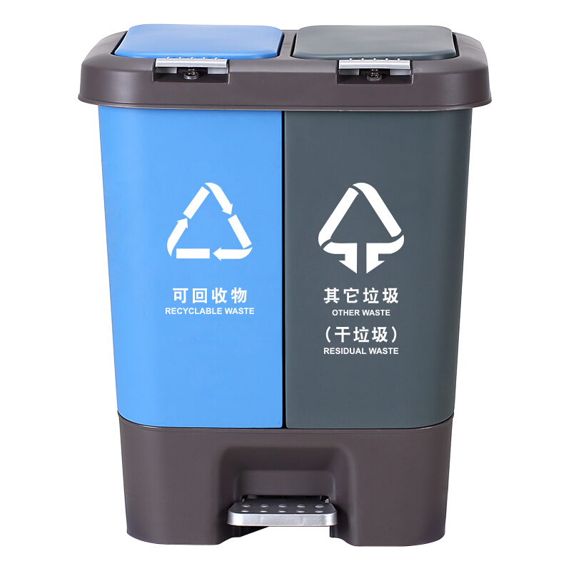 齐心L213 室内分类双格脚踏式垃圾桶 蓝+灰(可回收物+干垃圾)18L