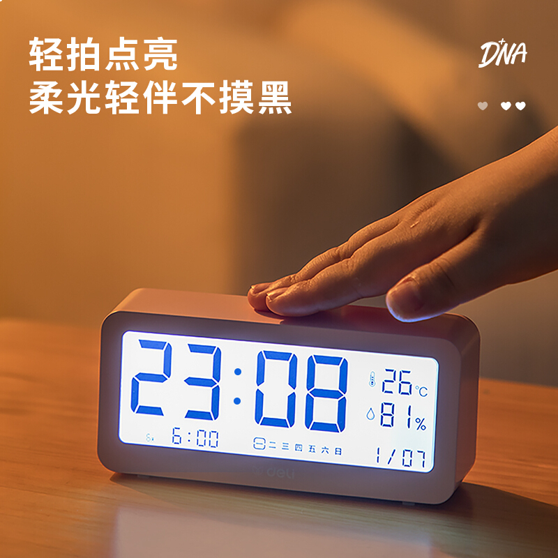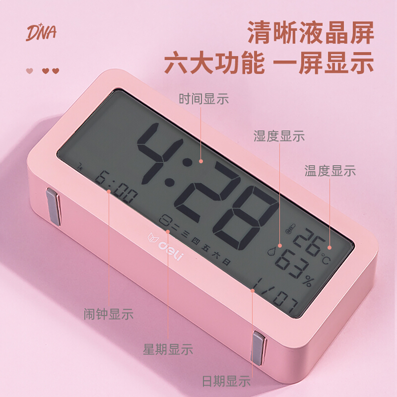 得力8826 多功能电子闹钟 背光电子钟 温湿度计功能 粉色