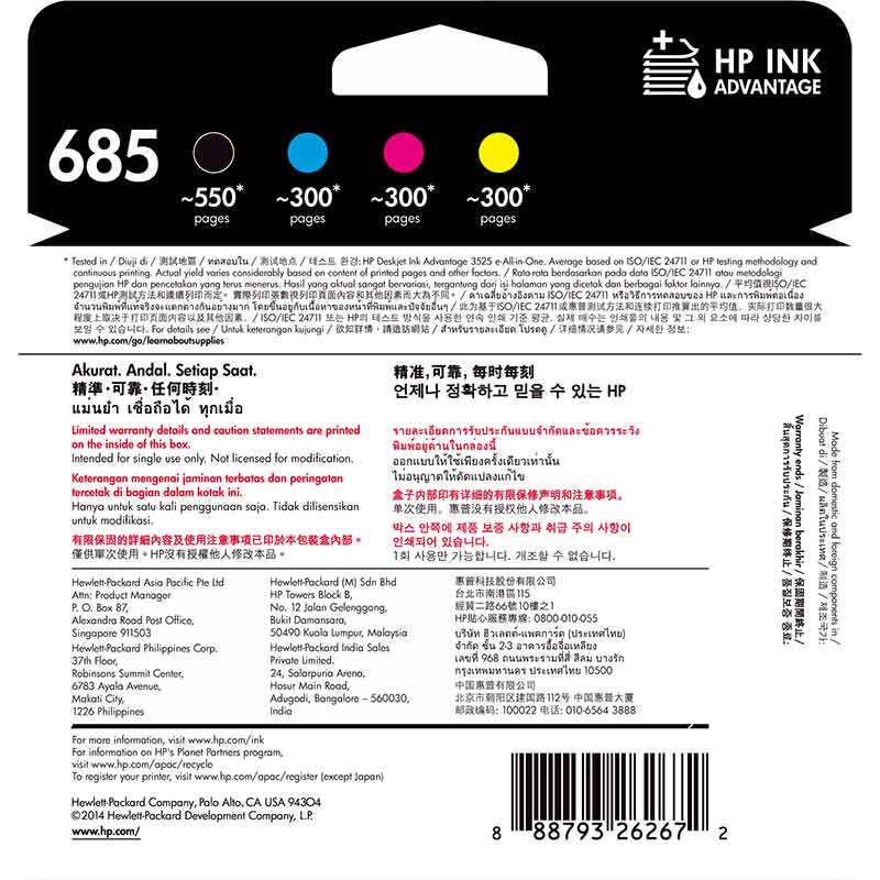 • 惠普 685 F6V35AA 黑彩套装(1黑3彩单盒装 适用hp 4615 AiO、4625 5525 3525 6525 eAiO Printer)