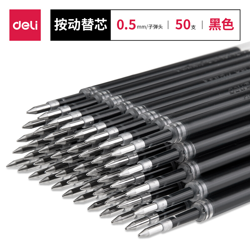 得力(deli)0.5mm按动中性笔替芯 水笔签字笔芯 办公用品 子弹头50支/盒33572