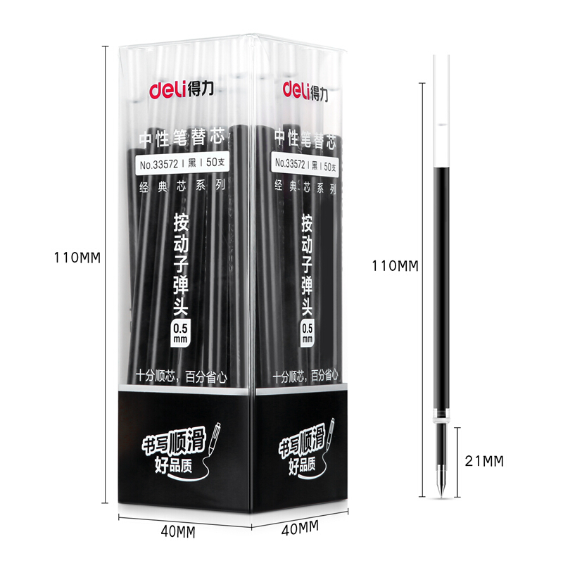 • 得力33572 按动中性笔替芯 0.5mm水笔签字笔芯 办公用品 子弹头50支/盒