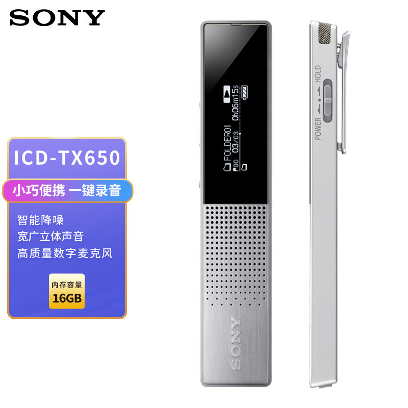 • 索尼(SONY)数码录音笔ICD-TX650 16GB大容量 银色 商务会议采访 专业录音智能降噪 微型便携一键录音