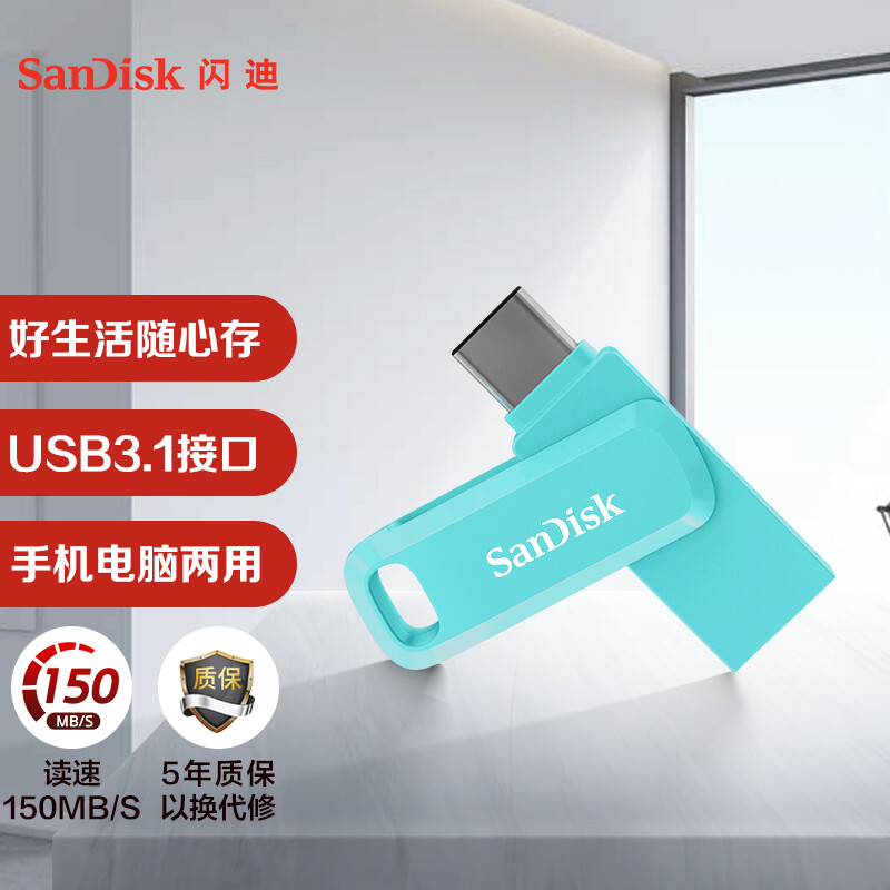 • 闪迪(SanDisk) 128GB Type-C USB3.1手机U盘DDC3 蓝色 至尊高速酷柔 传输速度150MB/s 双接口 APP管理软件
