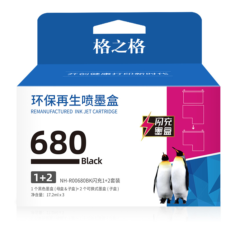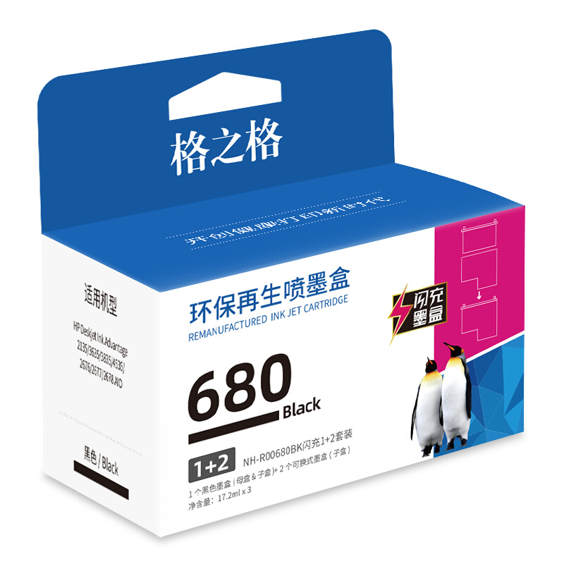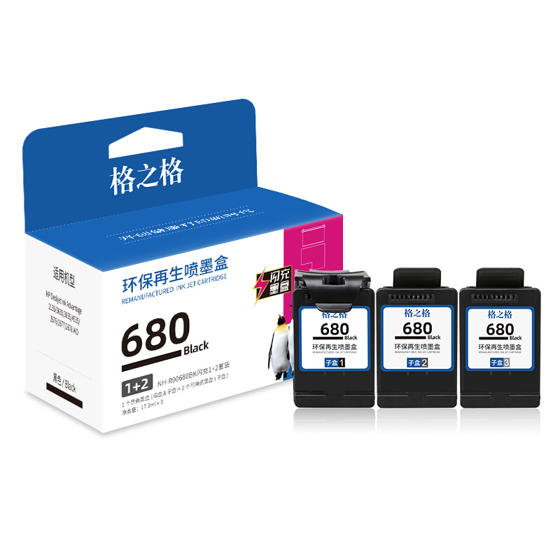 • 格之格 适用惠普680墨盒 3636墨盒 3638 3776 3777 2679 3838 2677 5088打印机墨盒hp1118闪充1+2黑色套装
