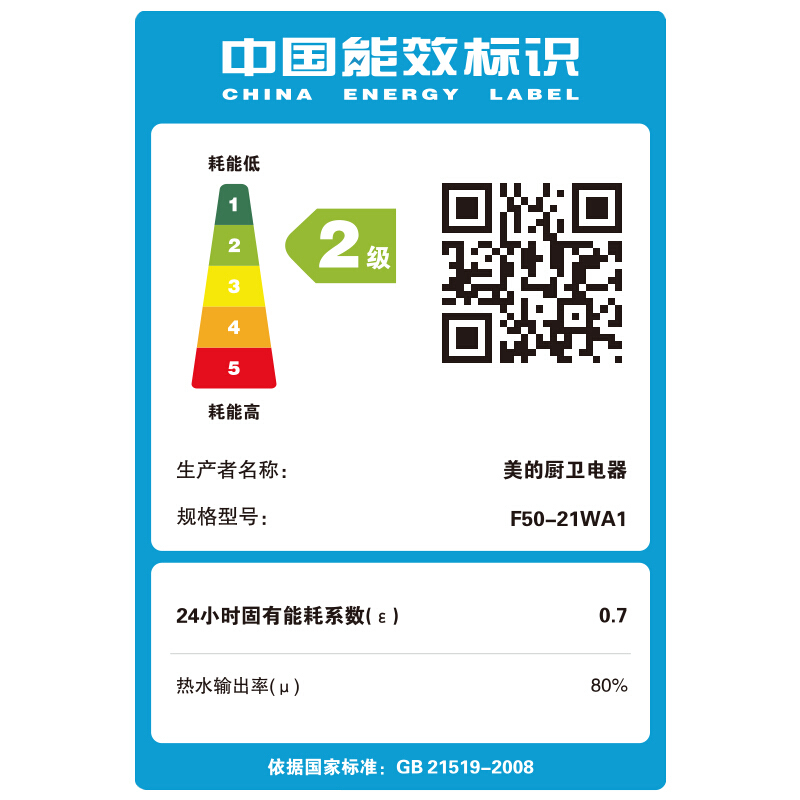 • 美的(Midea)2100W大功率电热水器50升 节能保温型 加长防电墙 蓝钻内胆8年包修F50-21WA1