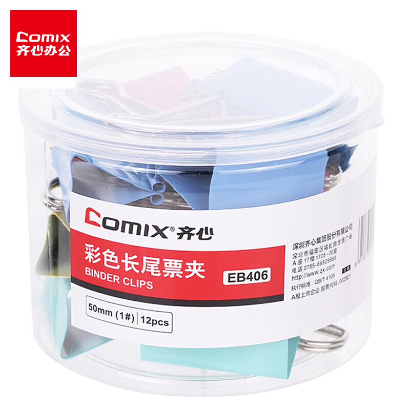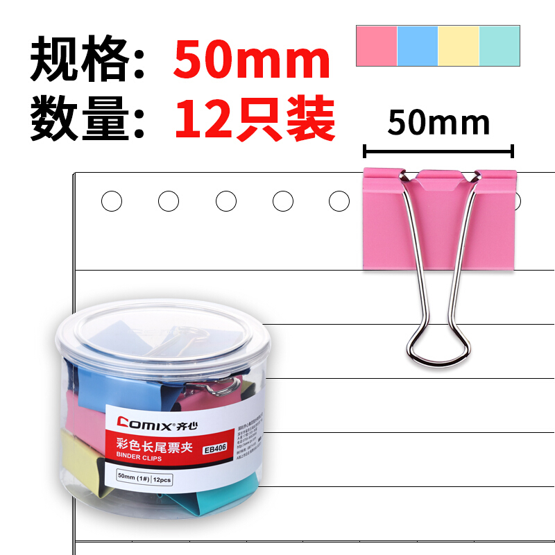 齐心(Comix)彩色长尾夹票夹 50mm金属燕尾夹票据夹子大号 12只/筒 办公用品EB406