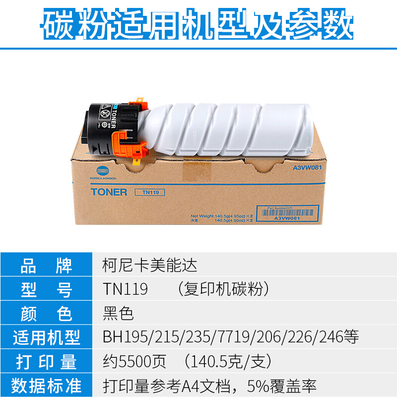 • 柯尼卡美能达TN119 黑色碳粉 适用于195/205i/206/225i/226/246/7723