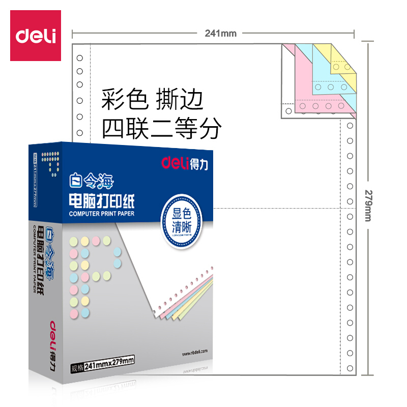 • 得力241-4-1/2CS 白令海 四联二等分撕边电脑打印纸 彩色针式打印纸(色序:白红蓝黄1000页/箱)