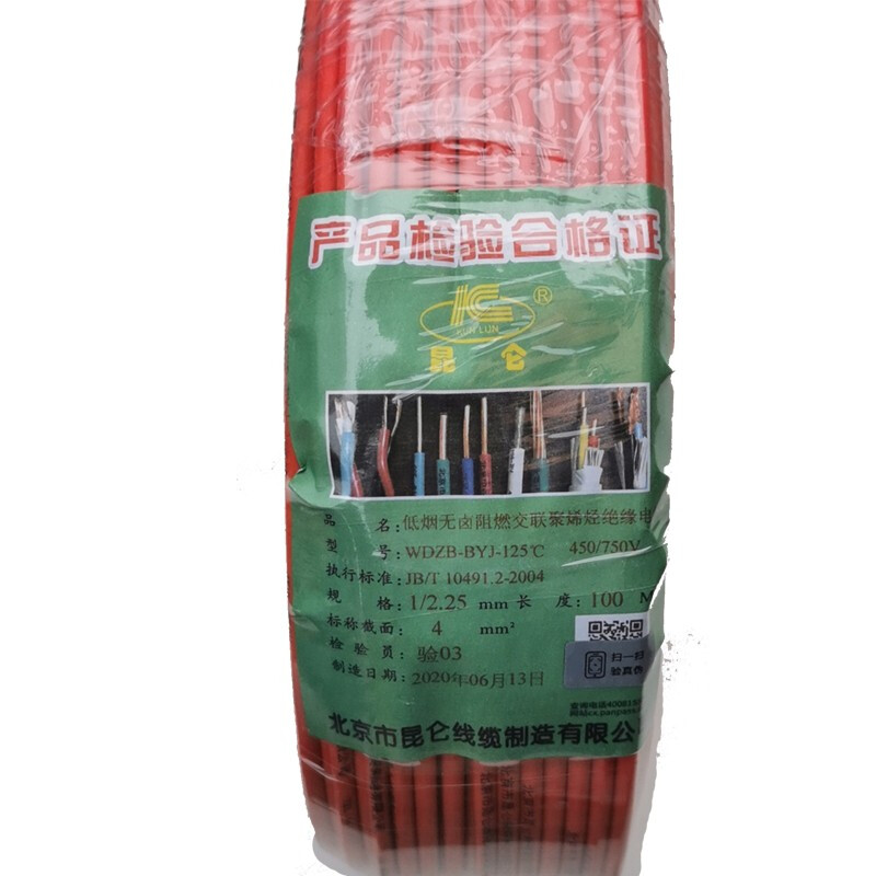 • 昆仑国标低烟无卤阻燃电线 WDZB-BYJ4平方 单色 100M/盘