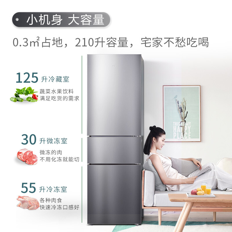 • TCL BCD-210TWZ50 210升 风冷无霜三门冰箱 电脑控温 冰箱小型便捷 节能静音小冰箱 (典雅银)