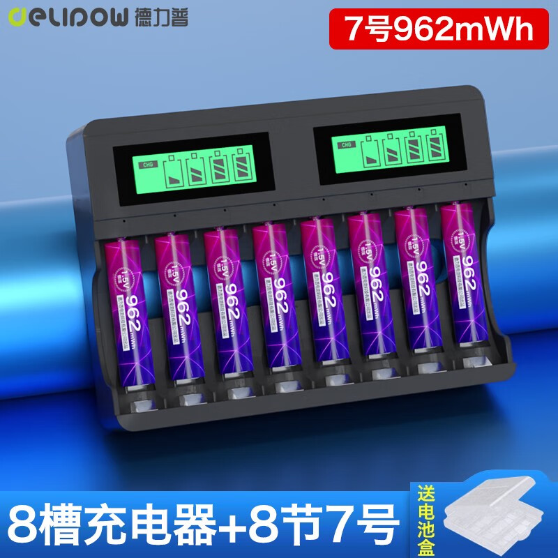 德力普(Delipow) 充电电池 7号锂电池 大容量3400mWh适用游戏手柄/键鼠/话筒/血压计 8槽液晶充电器+8节7号962mWh锂电池