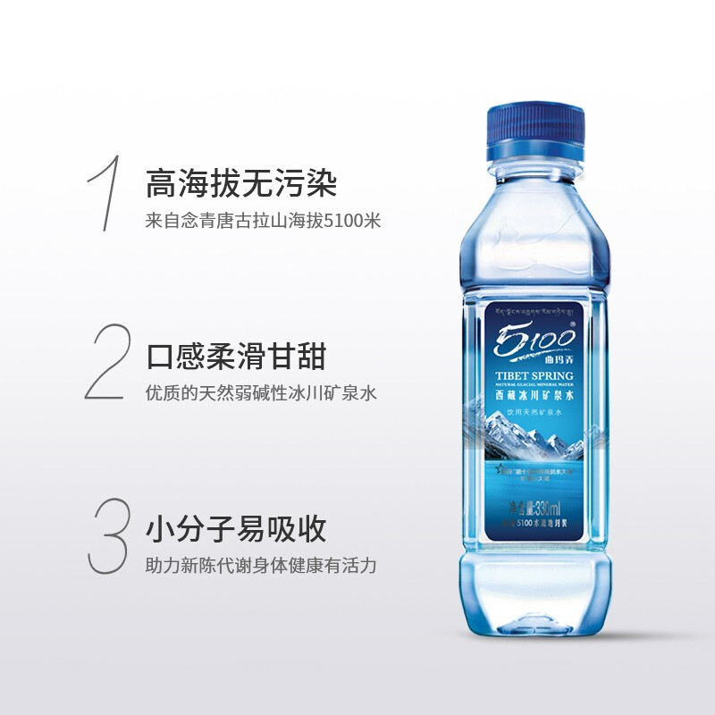 5100 西藏冰川 饮用天然矿泉水330ml*24瓶 弱碱性水 整箱装