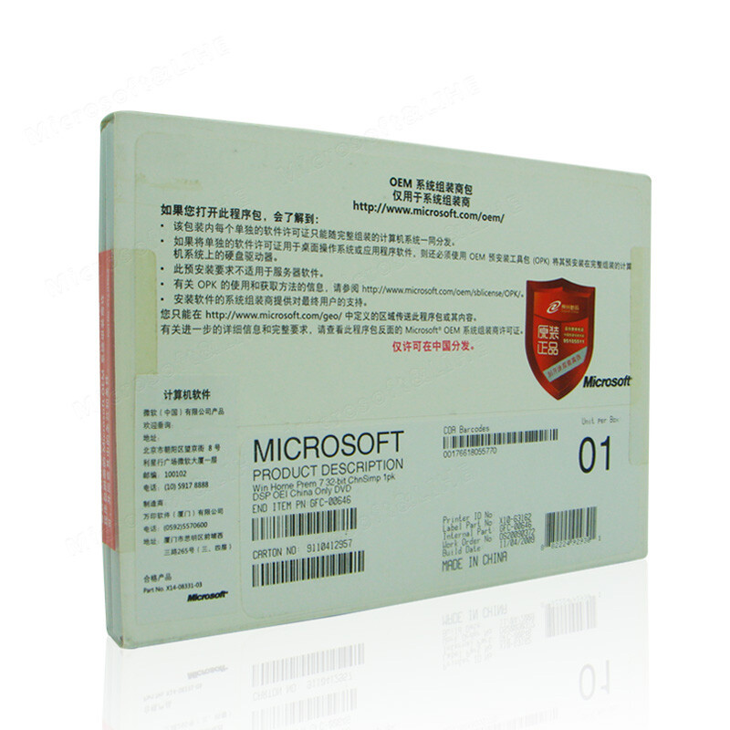 • 微软(Microsoft)Windows 7家庭版/专业版/Win7旗舰版/微软原装正版操作系统软件 高级家庭版 中文版 64位简包