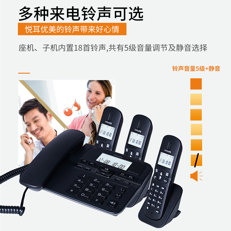 飞利浦DCTG188 HWDCD9889(188)TSD数字无绳电话机办公家用座机电话子母机免提通话/一键拨号/一拖三(黑色)
