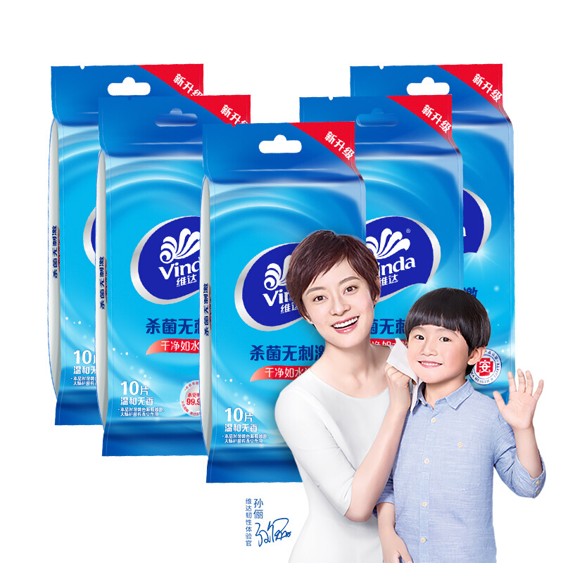 • 维达(Vinda)杀菌卫生湿巾10包 单片独立便携包装共100片 擦汗洁肤湿纸巾 不含酒精无刺激 浅蓝色