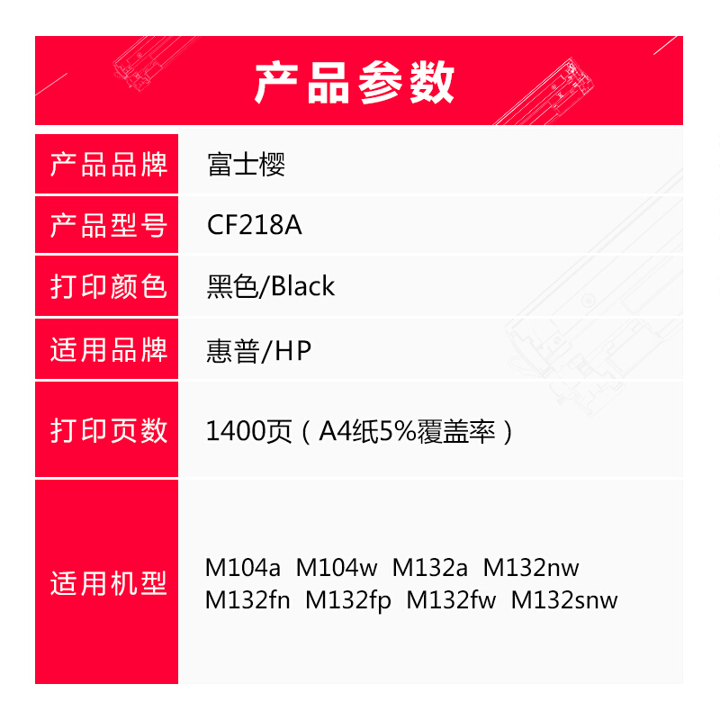 • 富士樱 CF218A 黑色墨粉盒 带芯片适用惠普M104a M104w M132a 132nw 132fn 132fp 132fw 132snw打印机硒鼓