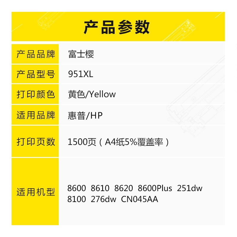 - 富士樱951XL Y大容量黄色墨盒 CN048AA 适用惠普 8600 8610 8620 8600Plus 251dw 8100 276dw