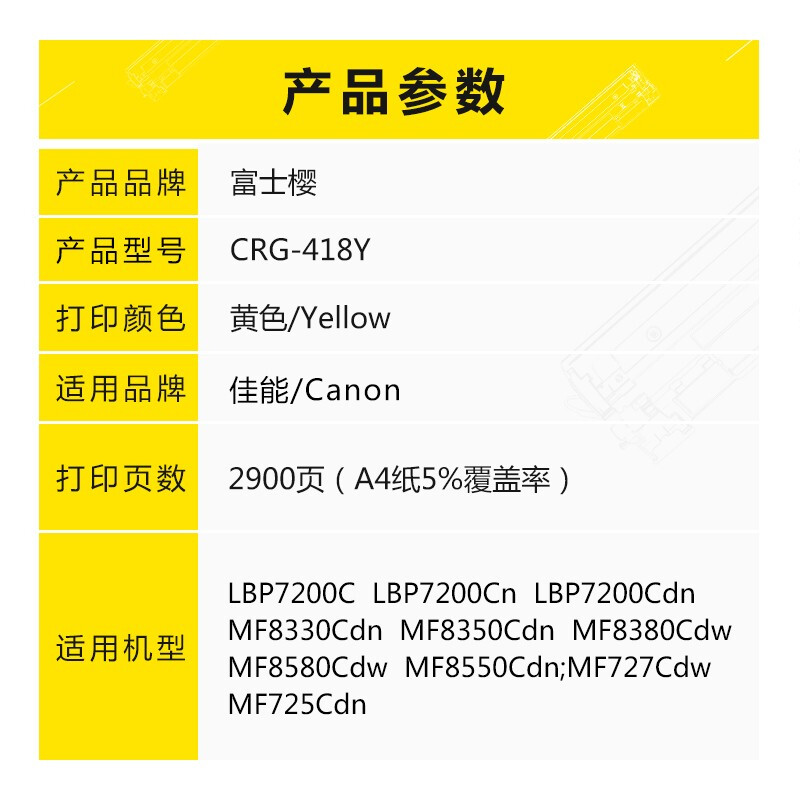 - 富士樱 CRG-418 Y 黄色硒鼓 (适用佳能iC MF8380Cdw/iC MF8350Cdn/iC MF8580Cdw/iC MF727Cdw LBP7200)