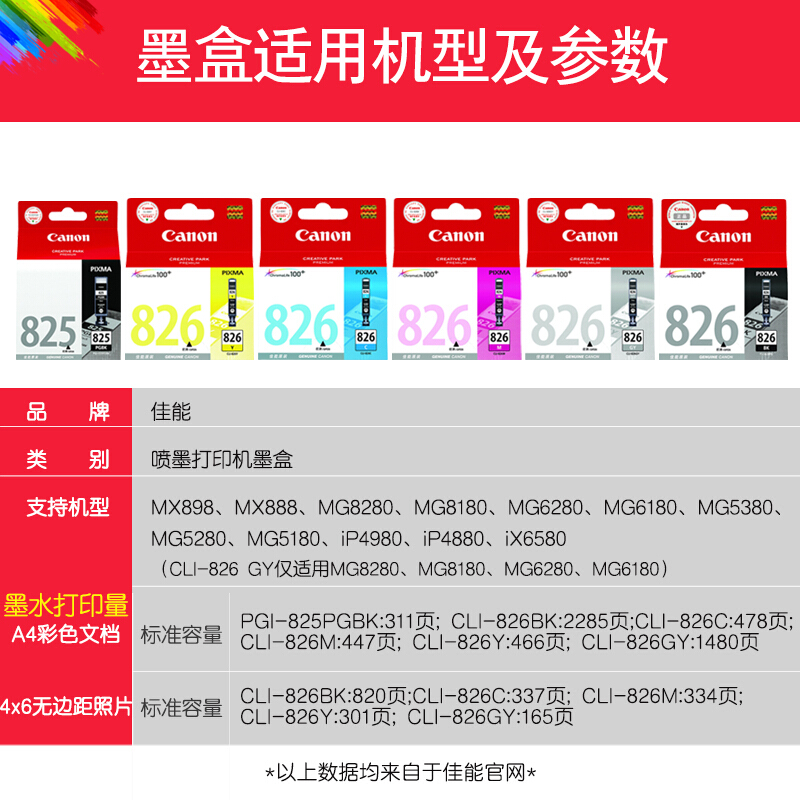 • 佳能PGI-825PGBK黑色墨盒CLI-826彩色墨盒(适用IP4980 IX6580) 五色一套