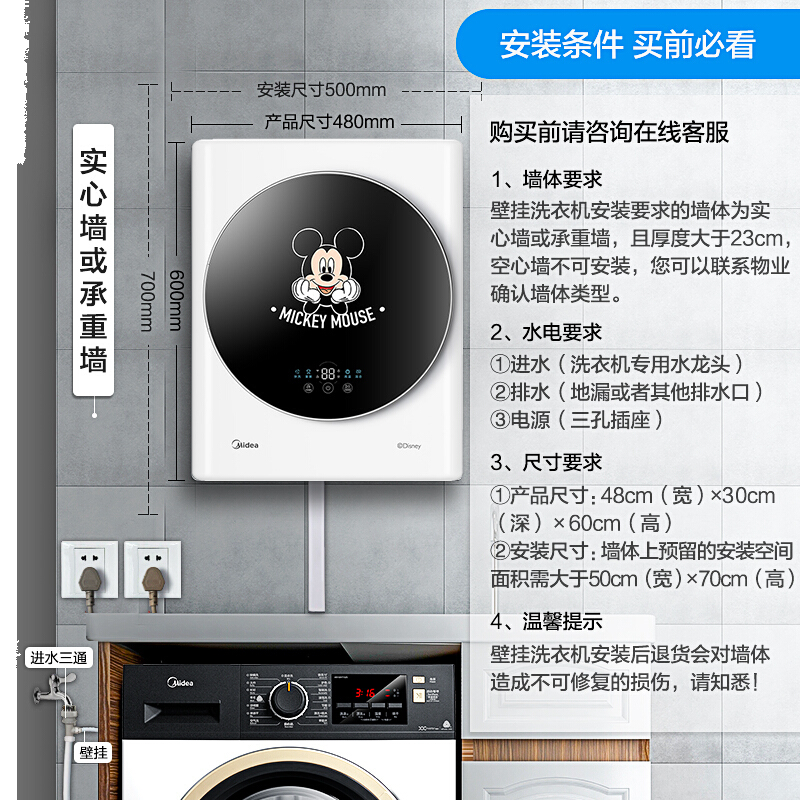 • 美的 MG30T2DSN 滚筒洗衣机全自动 智能 3公斤迷你壁挂小洗衣机 迪士尼定制 宝宝专享 银离子除菌