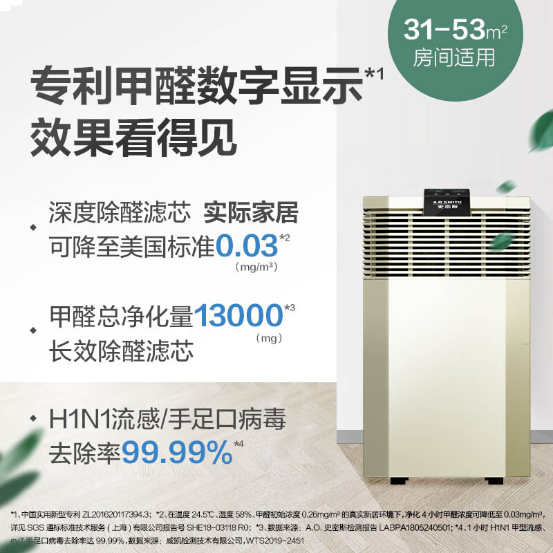 A.O.史密斯 【新品上市】甲醛数显 空气净化器 家用 深度除甲醛 除细菌病毒 除异味 PM2.5雾霾 JF1568