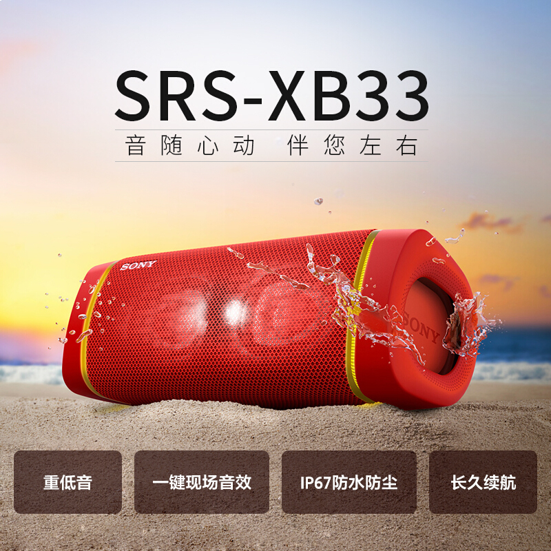 - 索尼(SONY)SRS-XB33 防水重低音 无线扬声器/蓝牙音响 三维音效 约24小时续航 IP67防水防尘 红色
