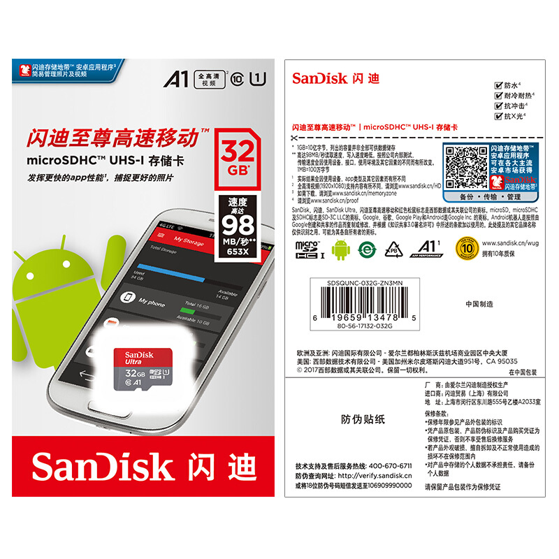闪迪(SanDisk)32GB TF(MicroSD)存储卡 U3 C10 A1 V30 4K 至尊极速移动版内存卡 读速100MB/s 写速60MB/s