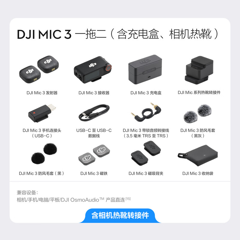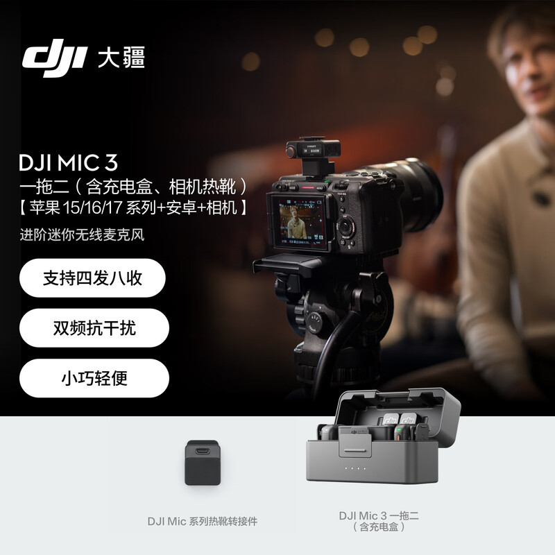 • 大疆 DJI Mic 3 进阶迷你无线麦克风一拖二(含充电盒、相机热靴) 苹果15/16/17系列+安卓+相机