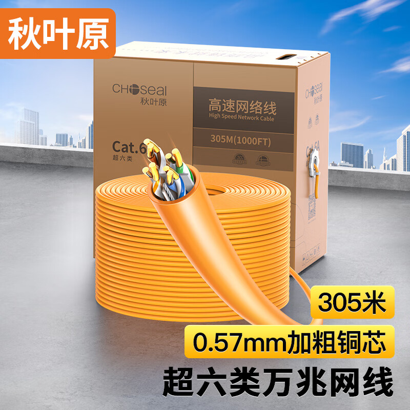 • 秋叶原(CHOSEAL)超六类非屏蔽网线 CAT6A类万兆高速 纯铜线芯 原装工程家装箱线 橙色 305米 QS2668CT305